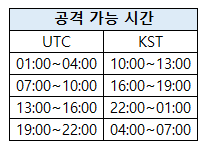 비밀병기는 하루 최대 5회까지 공격이 가능하며, 아래의 공격 가능 시간에 도전할 수 있습니다.