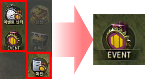 기존의 EVENT, 이벤트 센터, 미션 아이콘이 통합되어 이제는 모든 이벤트와 미션을