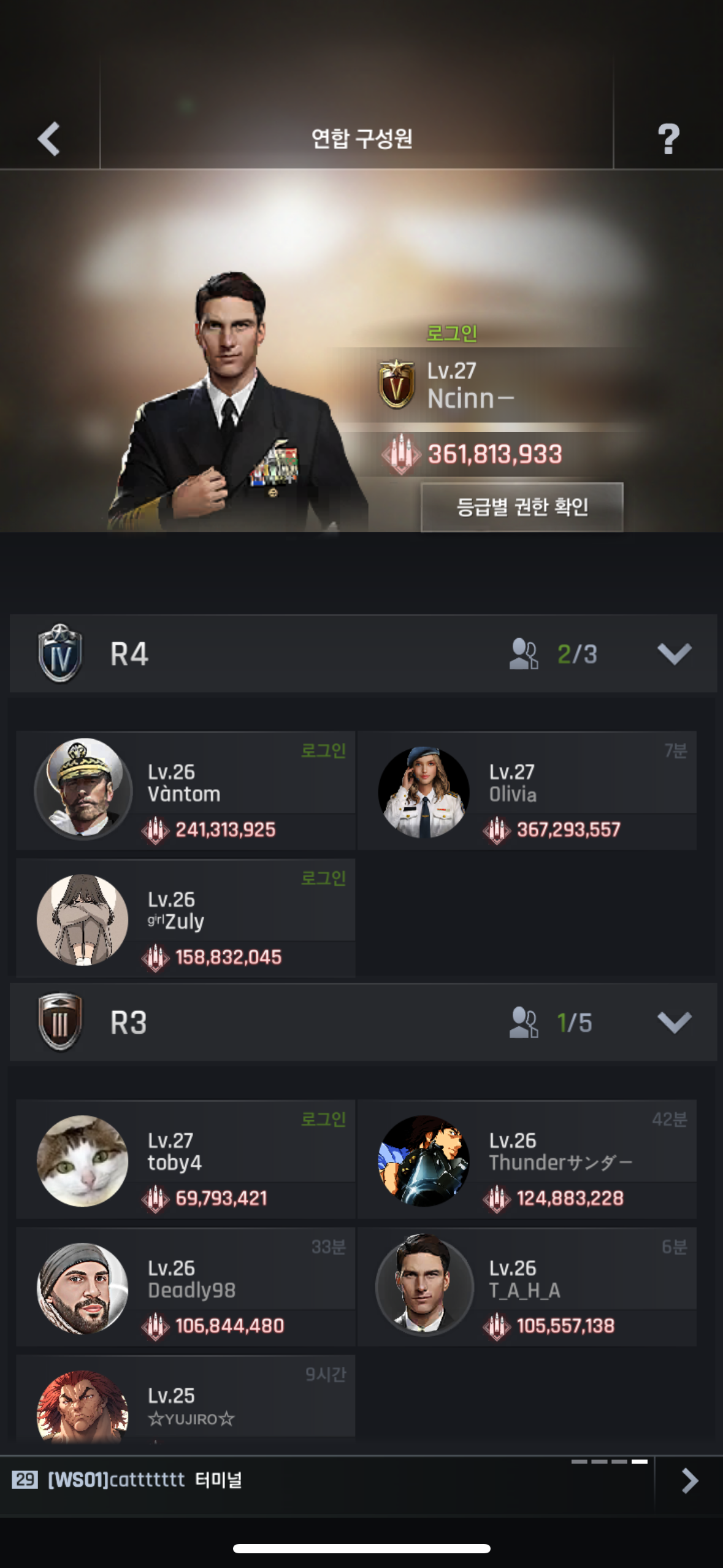 대부분 연맹채팅에서 영어로 대화하는데 다들 착하고 친절해서 모르는거 물어보면 다 알려줍니다. 특히 연맹장과 R4들이 엄청 적극적입니다.