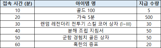 : 이벤트 기간 내 게임 누적 접속 시간에 따라 보상을 획득할 수 있습니다.