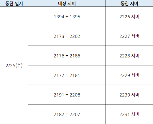 : 통합 대상인 서버는 2월 24일부터 2월 25일까지 진행되는 서버침공 참여 서버에서 제외됩니다.