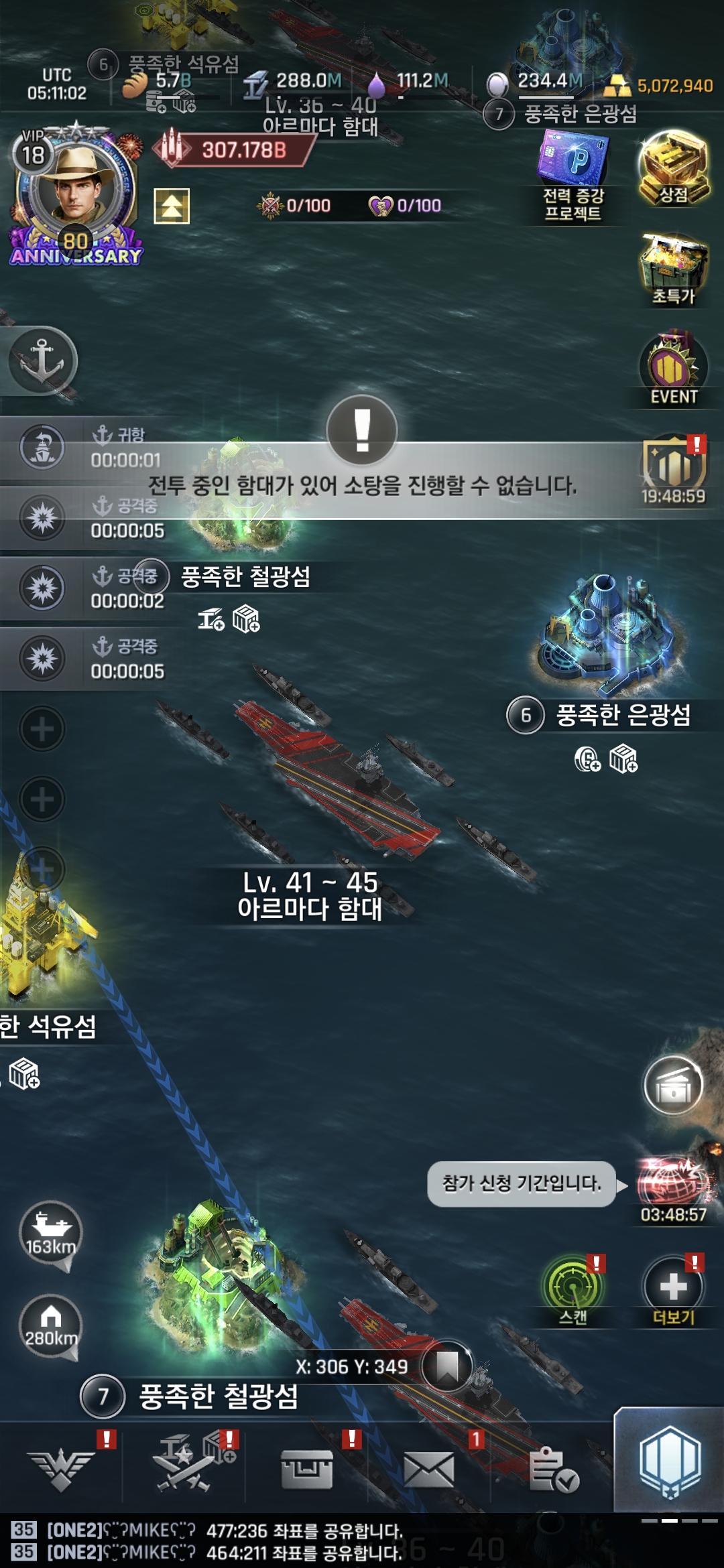함대를 잡고난 후 친위대가 안나오고 그냥 함대가 나와서 잡으려 하니 그림과 같은 메시지가 나오며 공격이 안되네요
