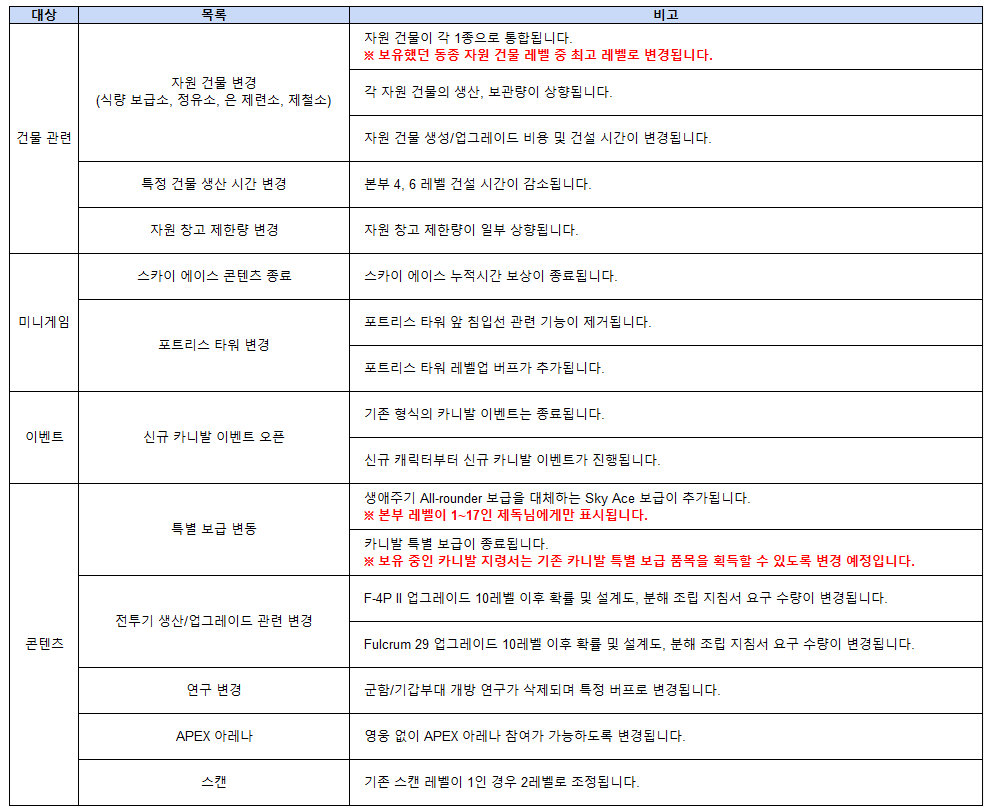 ◆ 일부 건물 및 콘텐츠 변경 사항
