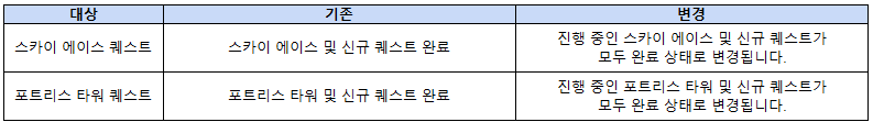 ◆ 스카이 에이스 및 포트리스 타워 관련 퀘스트 변경 사항