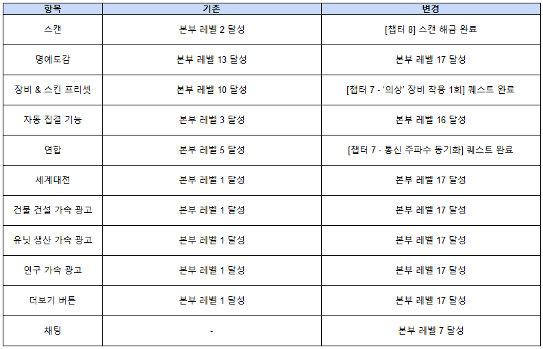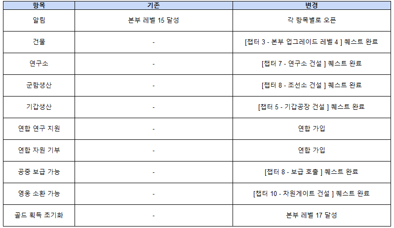 ◆ 일부 콘텐츠 오픈 조건 변경 사항